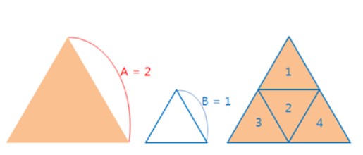 A = 2, B = 1 일 때의 한 변의 길이가 B인 정삼각형의 최소 개수는 아래 그림과 같다.