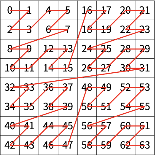 만약, N > 1이 라서 왼쪽 위에 있는 칸이 하나가 아니라면, 배열을 크기가 2N-1 × 2N-1로 4등분 한 후에 재귀적으로 순서대로 방문한다.