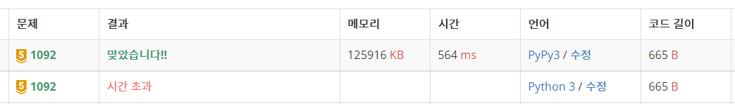 결과는 Pypy3에서는 정답이지만, Python3에서는 시간 초과가 떴습니다.