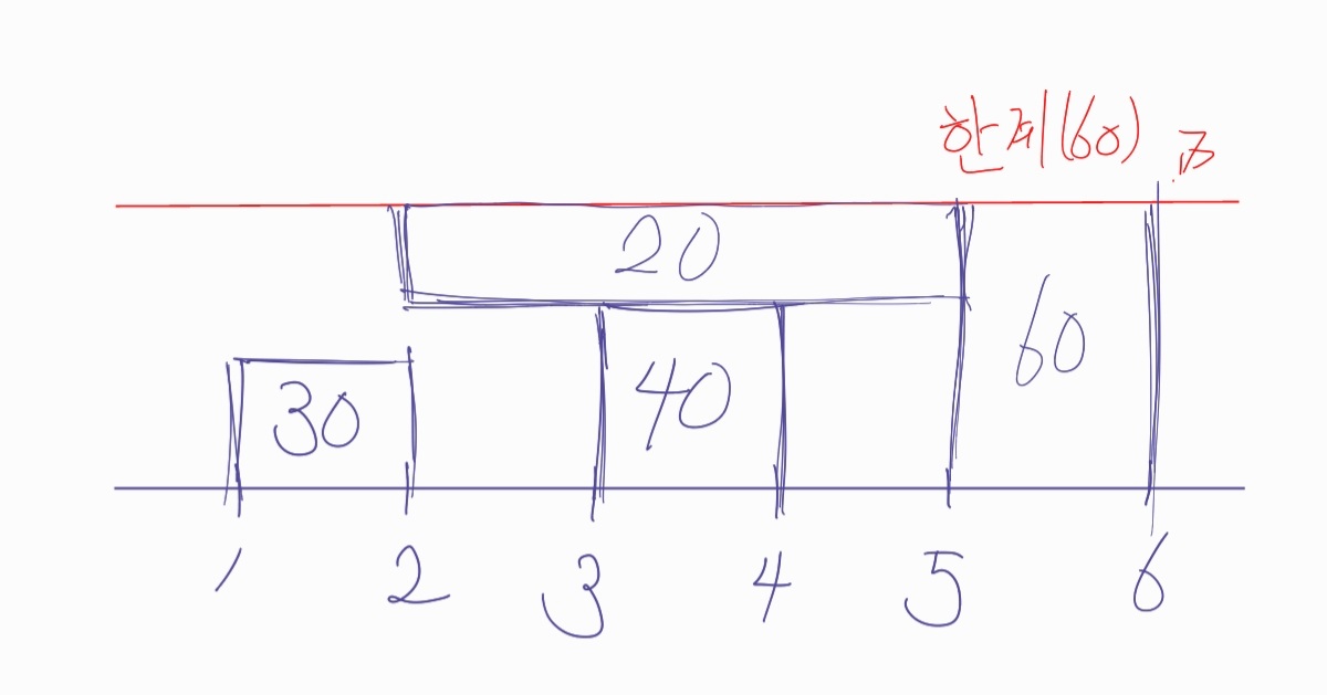 - 2번 마을에서 5번 마을까지 70을 실어야하는데 3번 마을에서 4번 마을까지 이미 40을 실었으니, 여기서는 20을 싣는다.