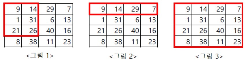 예를 들어, 위와 같이 사람이 살고 있다고 가정할 때 <그림 1>의 직사각형 범위의 사람 수를 알고 싶다면 진경대왕은 네 개의 정수 1 1 3 2를 부를 것이다. 마찬가지로 <그림 2>는 1 1 1 4, <그림 3>은 1 1 4 4가 될 것이다.